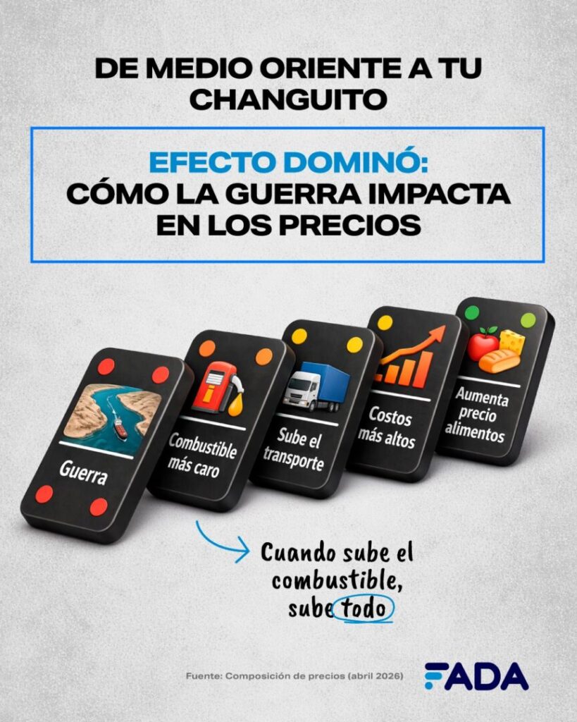 La guerra en Medio 0riente empieza a impactar en las góndolas. Actualmente, los costos son: el 51% del precio de la carne, el 61% del pan y el 71% de la leche y podrían pesar más por el aumento del combustible y la urea que se utiliza para los cultivos. “Lo que pasa en Medio Oriente afecta nuestros bolsillos: en el actual contexto de guerra, el primer costo que va a subir es el de los fletes, principalmente por el aumento en los combustibles debido al bloqueo del estrecho de Ormuz. El flete representa el 6% del precio del sachet de leche y es el 8% de los costos del productor de trigo”, detalla Nicolle Pisani Claro, Economista Jefa FADA. “Los aumentos en la logística van a repercutir en precios y en las ganancias de los diferentes eslabones que producen estos alimentos”, afirma la economista.